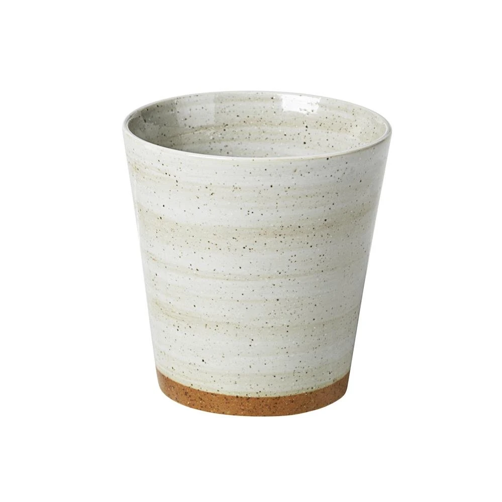 Dieser Becher aus der Grød-Porzellanserie von Broste Copenhagen sticht mit einem braunen Rand an der Unterseite ins Auge, der fast wirkt, als ob der Becher auf einem Untersetzer aus Kork steht. Broste Copenhagen hat dieses Geschirr in Zusammenarbeit mit Grød, einem Trendrestaurant in Kopenhagen, das für seinen „Grød“ (deutsch: Brei) in kreativen Ausführungen berühmt ist.